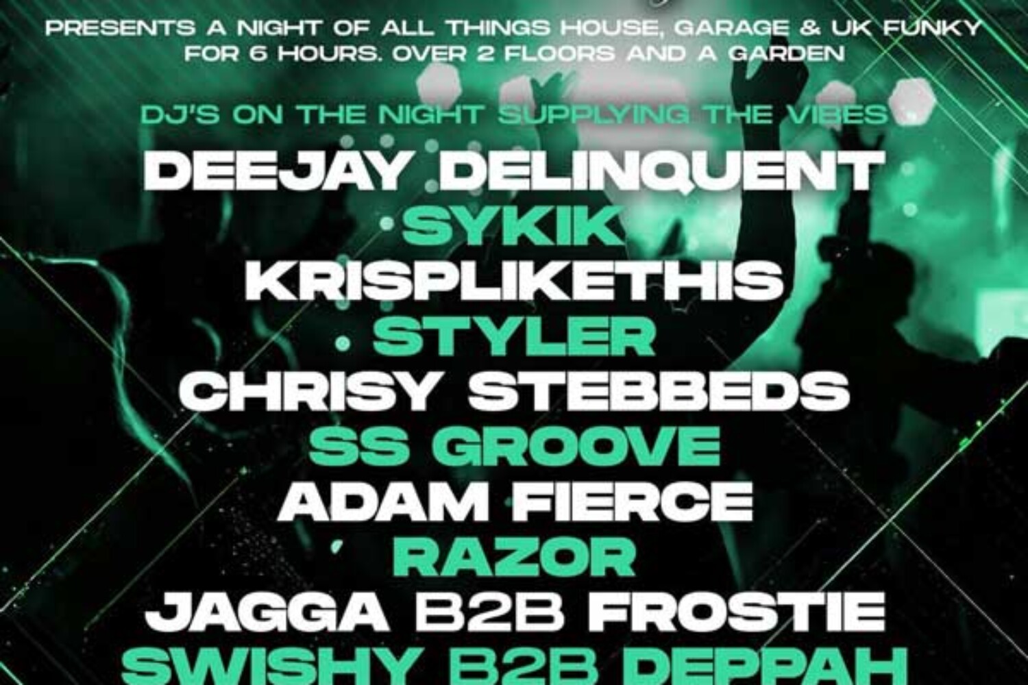 A night of House, Garage & UK Funky over 2 floors at sunrooms². DJs being Deejay Delinquent Sykik Krisplikethis Styler Chrisy Stebbeds and more.