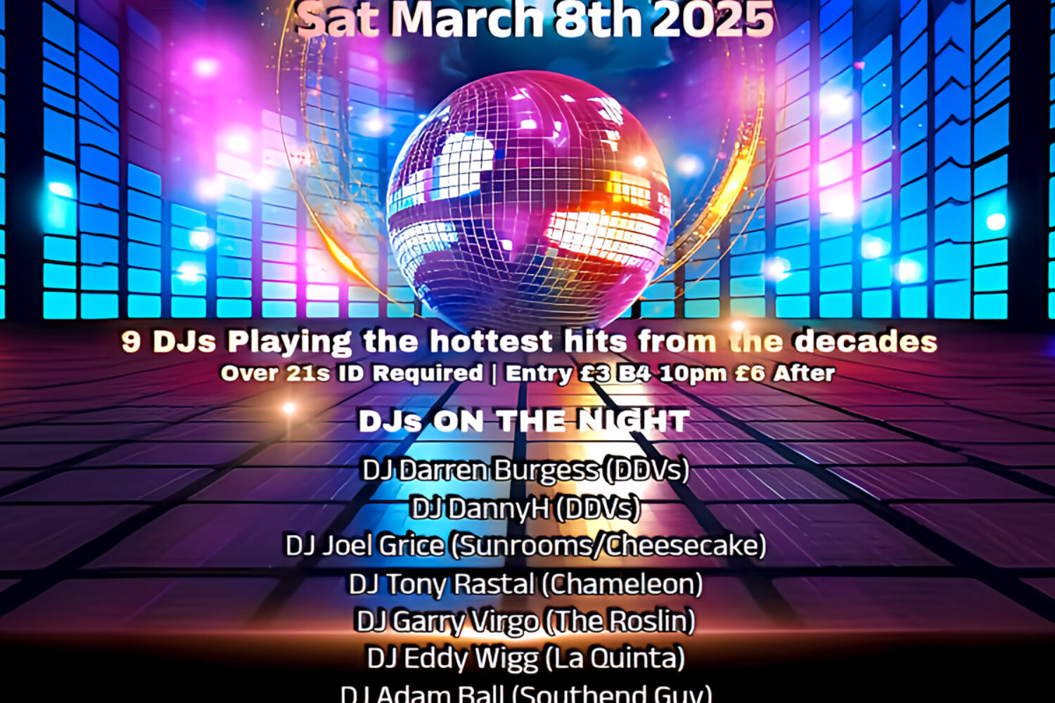 8 March 2025 Robbie Elmore Saturday 8th March – Sunshine – Southend’s Club Reunion Night When 8 March 2025 - 9 March 2025 21:00 - 03:00 Add To Calendar Download ICS Google Calendar iCalendar Office 365 Outlook Live Event Type All Everything This night brings all the memories back, celebrating Southend’s major night spots that have sadly faded away. Hosted By Darren B
