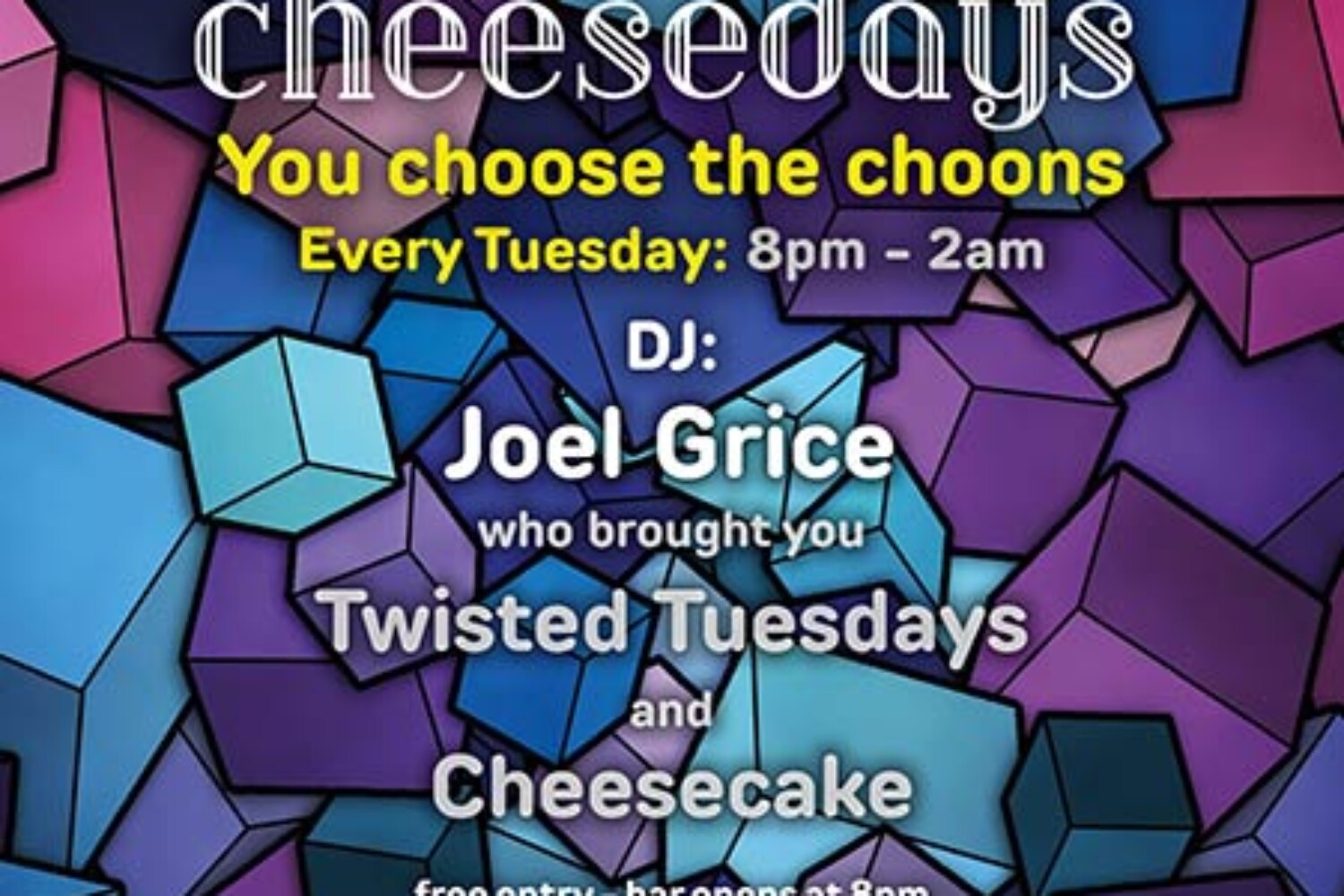 31 December 2024 sr_admin Every Tuesday – Cheesedays When 31 December 2024 20:00 - 02:00 Add To Calendar Download ICS Google Calendar iCalendar Office 365 Outlook Live Event Type Everything Bar opens at 8pm Joel Grice presents Cheesedays each and every Tuesday. You choose the tunes. It’s the successor to Twisted Tuesdays and Cheesecake. Drink deals and promotions. Bar opens 8pm.